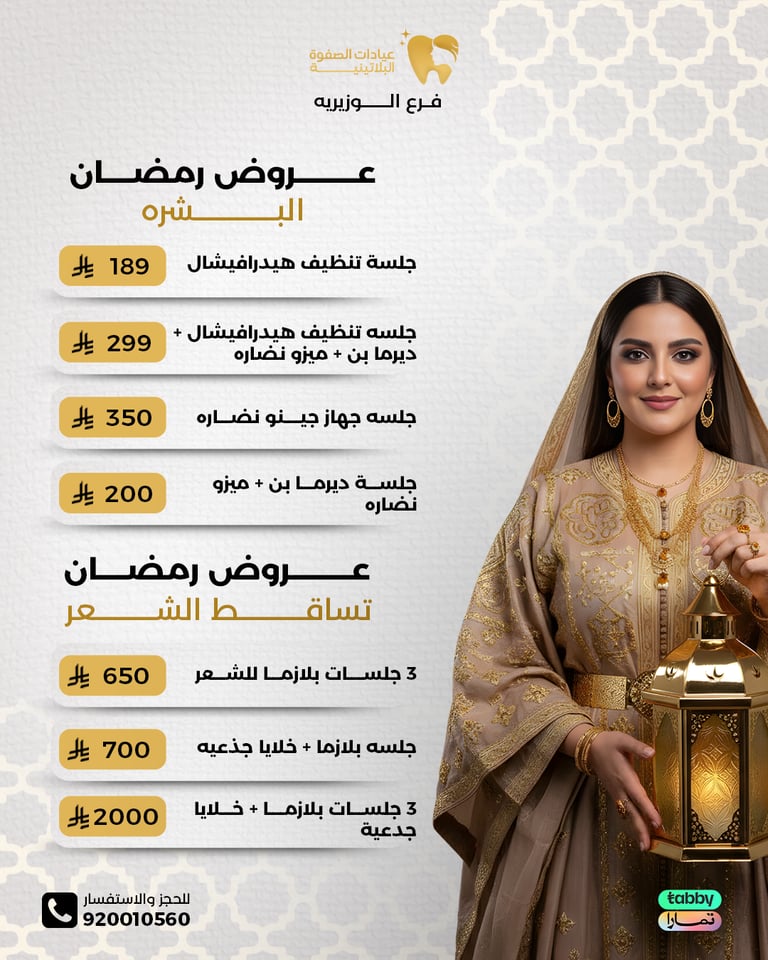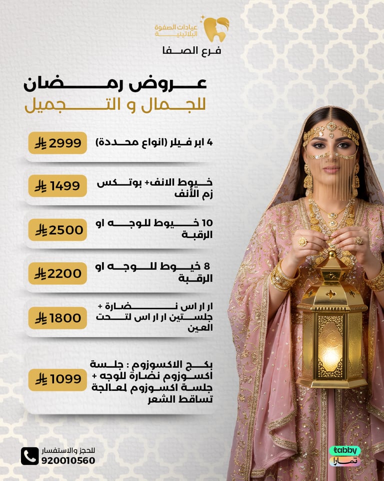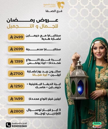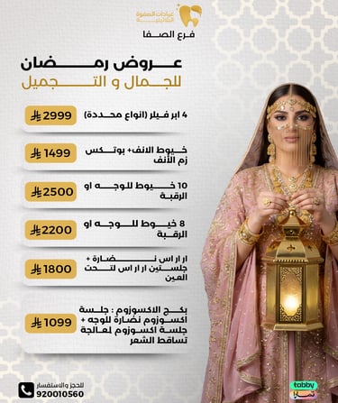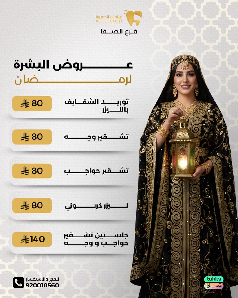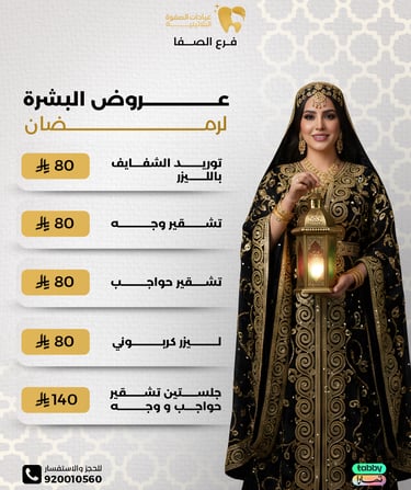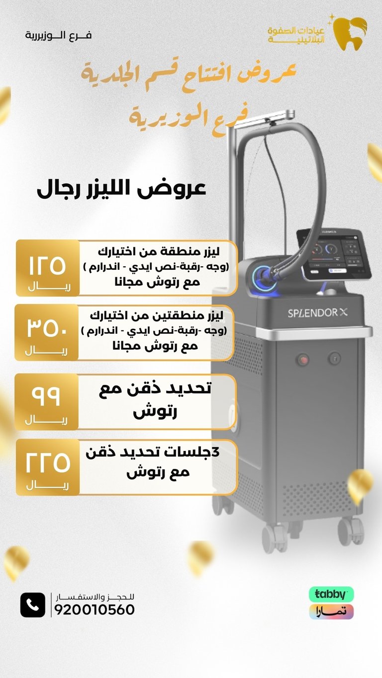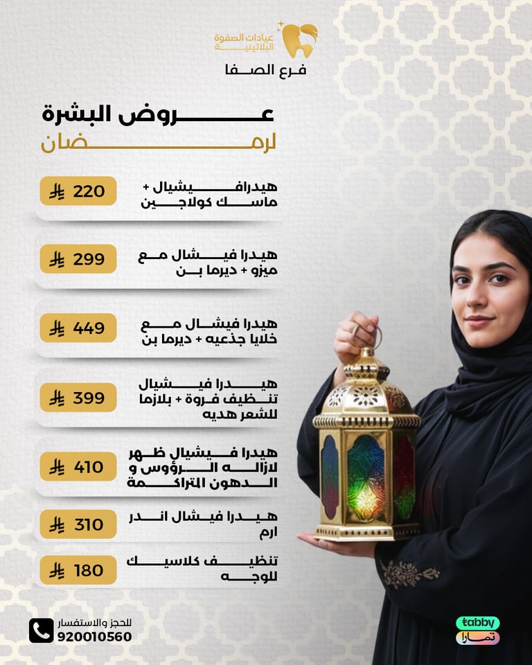عيادة الصفوة البلاتينية من افضل العيادات في جدة والمكان نظيف ورائحة النظافة على طول موجودة عن تجربة شخصية اكثر من سنة الدكتور محمد خليل متابع معك في الواتس اول بأول ويرد على الاسئلة ومو مقصر بشيء عن تجربه معه. بالنسبة للسعر اسعارهم جدا حلوه مقارنتاً باللي حوله بنفس الشغل والجودة غير كذا عندهم خدمة التقسيط في تابي وتمارا .