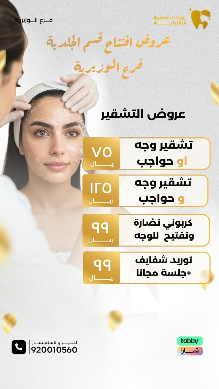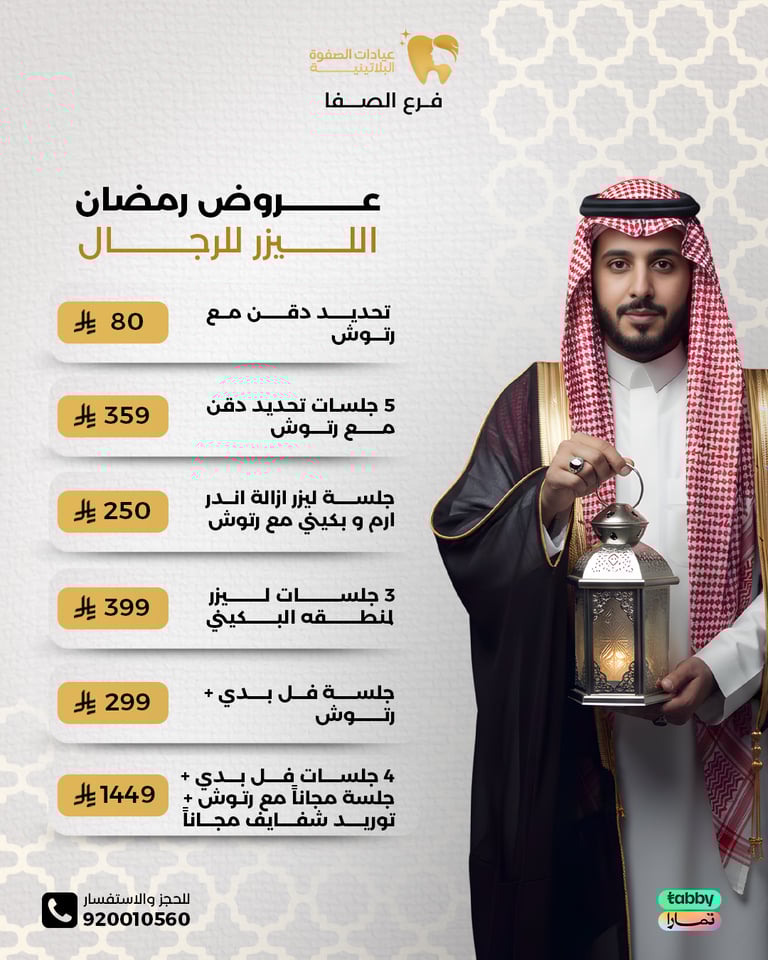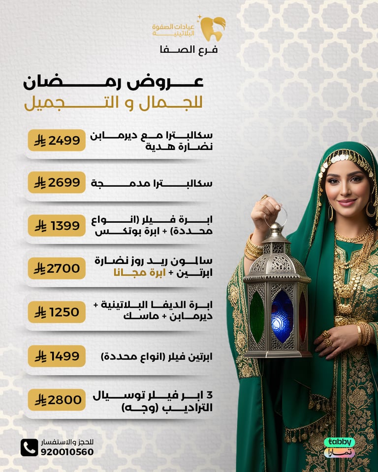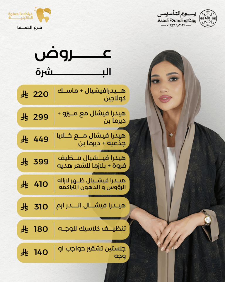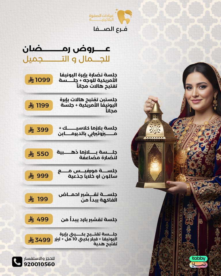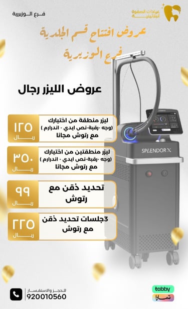 عيادة الصفوة البلاتينية من افضل العيادات في جدة والمكان نظيف ورائحة النظافة على طول موجودة عن تجربة شخصية اكثر من سنة الدكتور محمد خليل متابع معك في الواتس اول بأول ويرد على الاسئلة ومو مقصر بشيء عن تجربه معه. بالنسبة للسعر اسعارهم جدا حلوه مقارنتاً باللي حوله بنفس الشغل والجودة غير كذا عندهم خدمة التقسيط في تابي وتمارا .