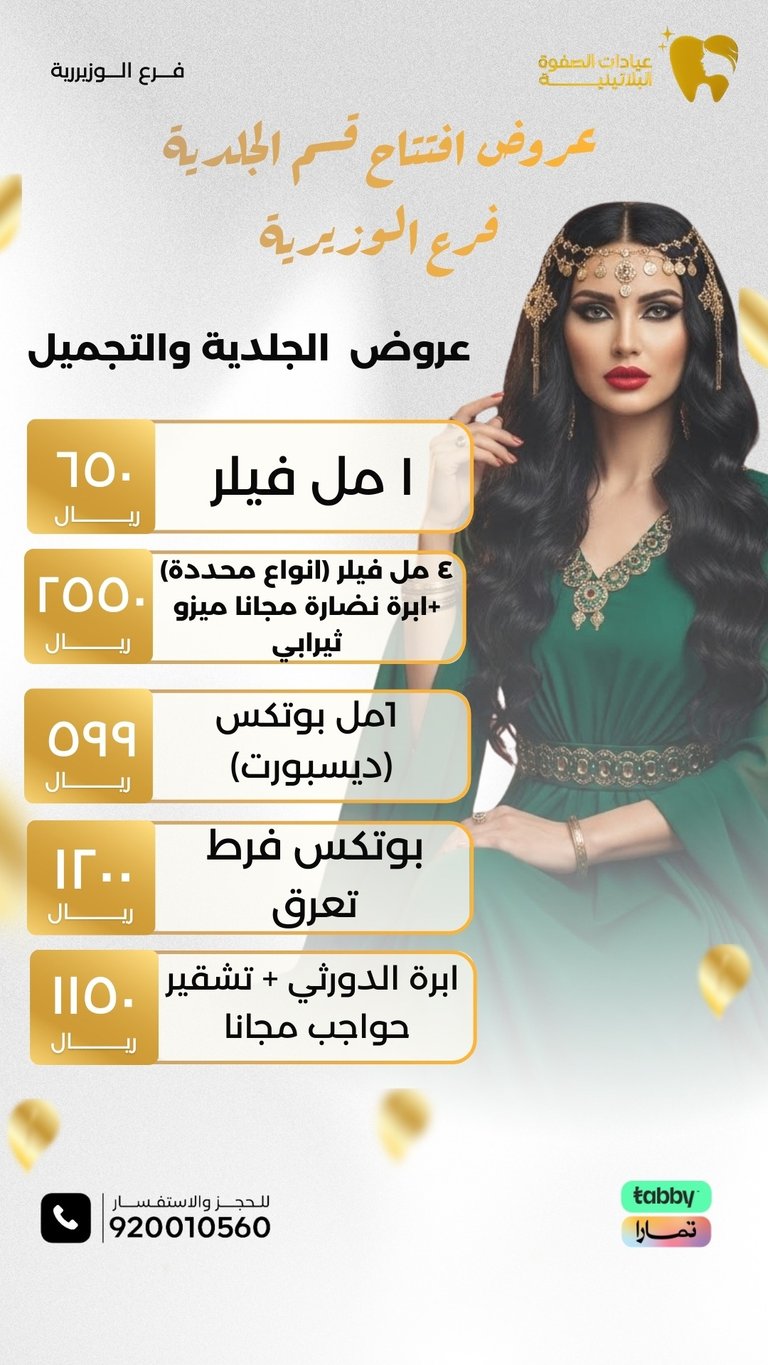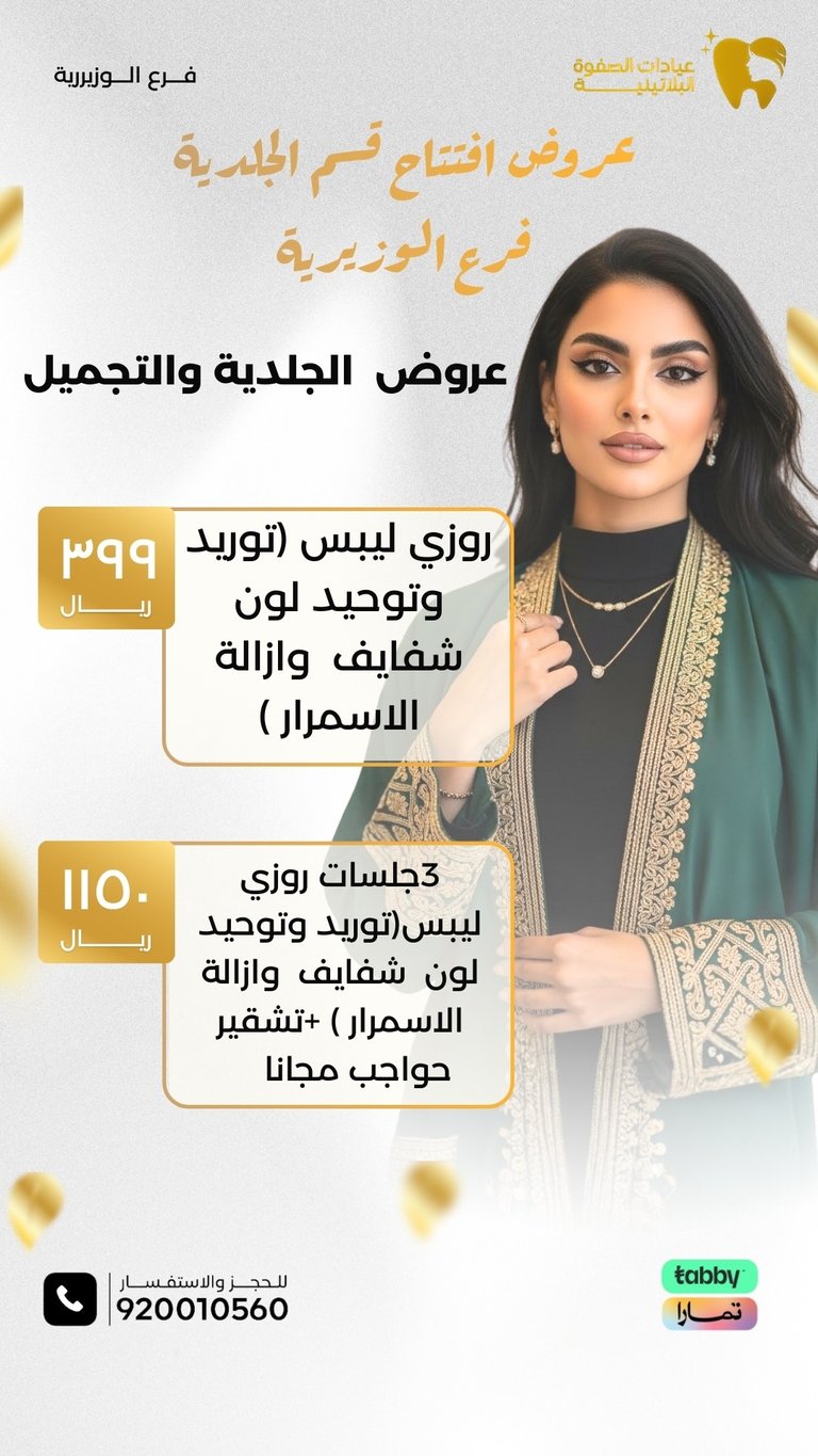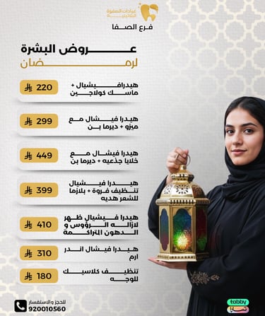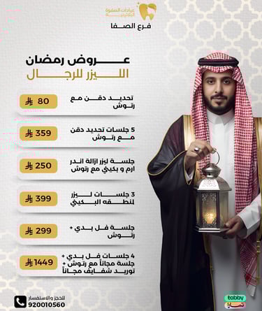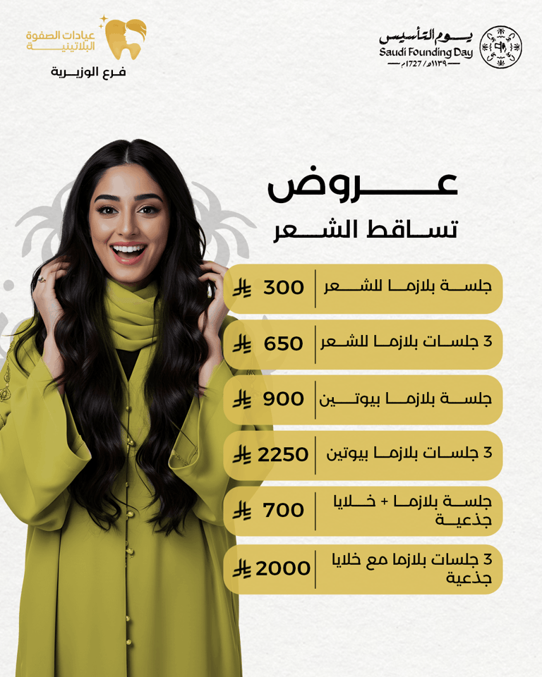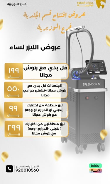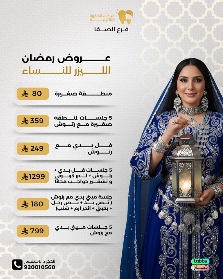 عيادة الصفوة البلاتينية من افضل العيادات في جدة والمكان نظيف ورائحة النظافة على طول موجودة عن تجربة شخصية اكثر من سنة الدكتور محمد خليل متابع معك في الواتس اول بأول ويرد على الاسئلة ومو مقصر بشيء عن تجربه معه. بالنسبة للسعر اسعارهم جدا حلوه مقارنتاً باللي حوله بنفس الشغل والجودة غير كذا عندهم خدمة التقسيط في تابي وتمارا .